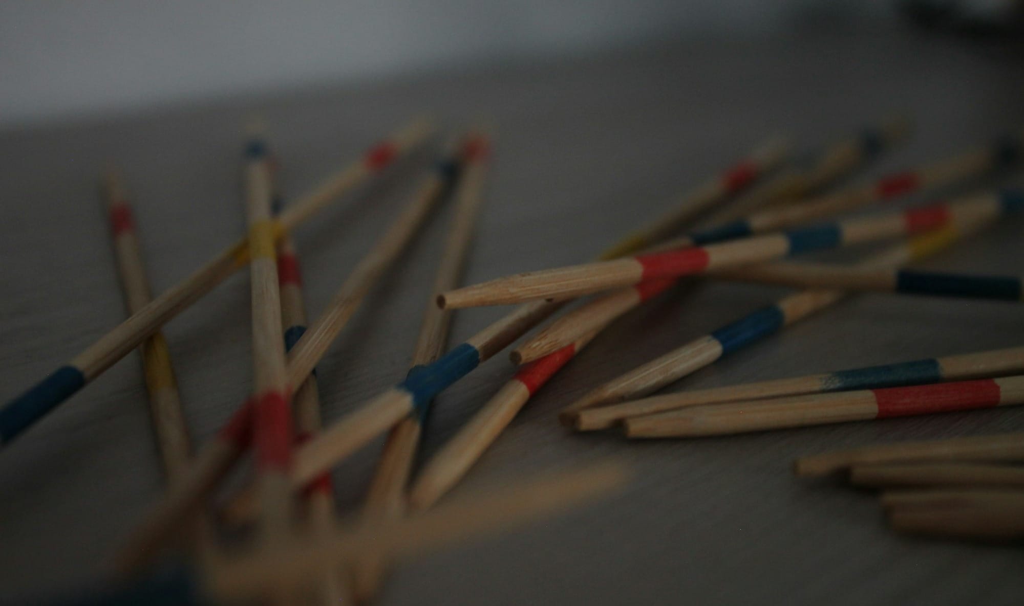 L’idée, ce n’est pas de « lancer » les baguettes comme des fléchettes. Juste les relâcher, et laisser le hasard faire sa vie. Normalement, vous obtenez un enchevêtrement de baguettes, certaines isolées, d’autres coincées en dessous.